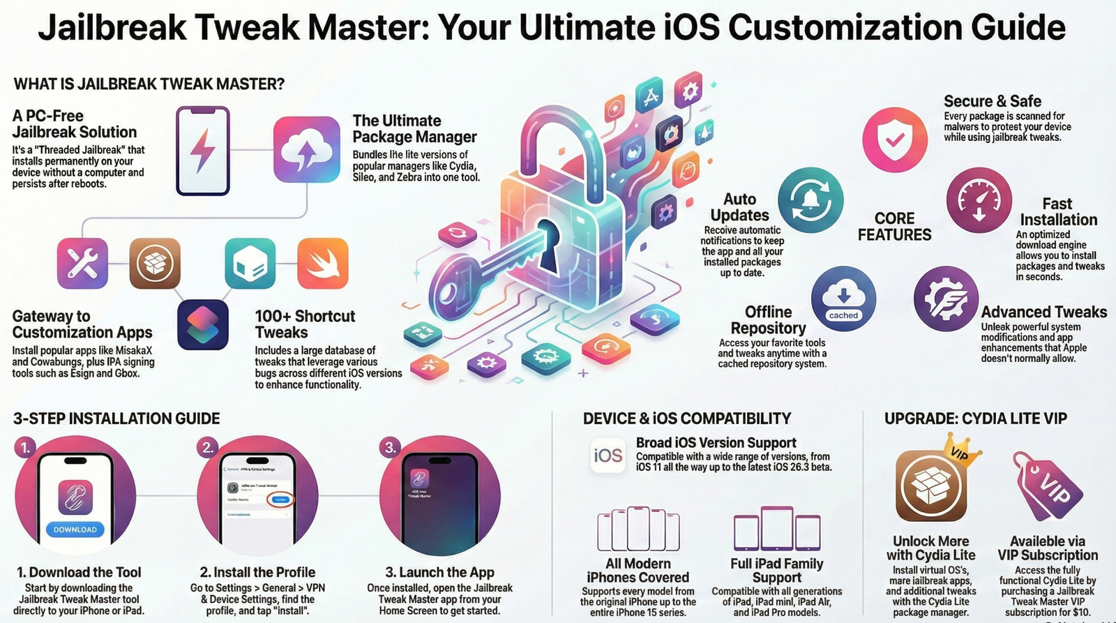 Everything you need to know about Jailbreak Tweak Master tool and whether it is worth getting a VIP subscription. Jailbreak Tweak Master is compatible with iOS 26.3 beta through iOS 11.